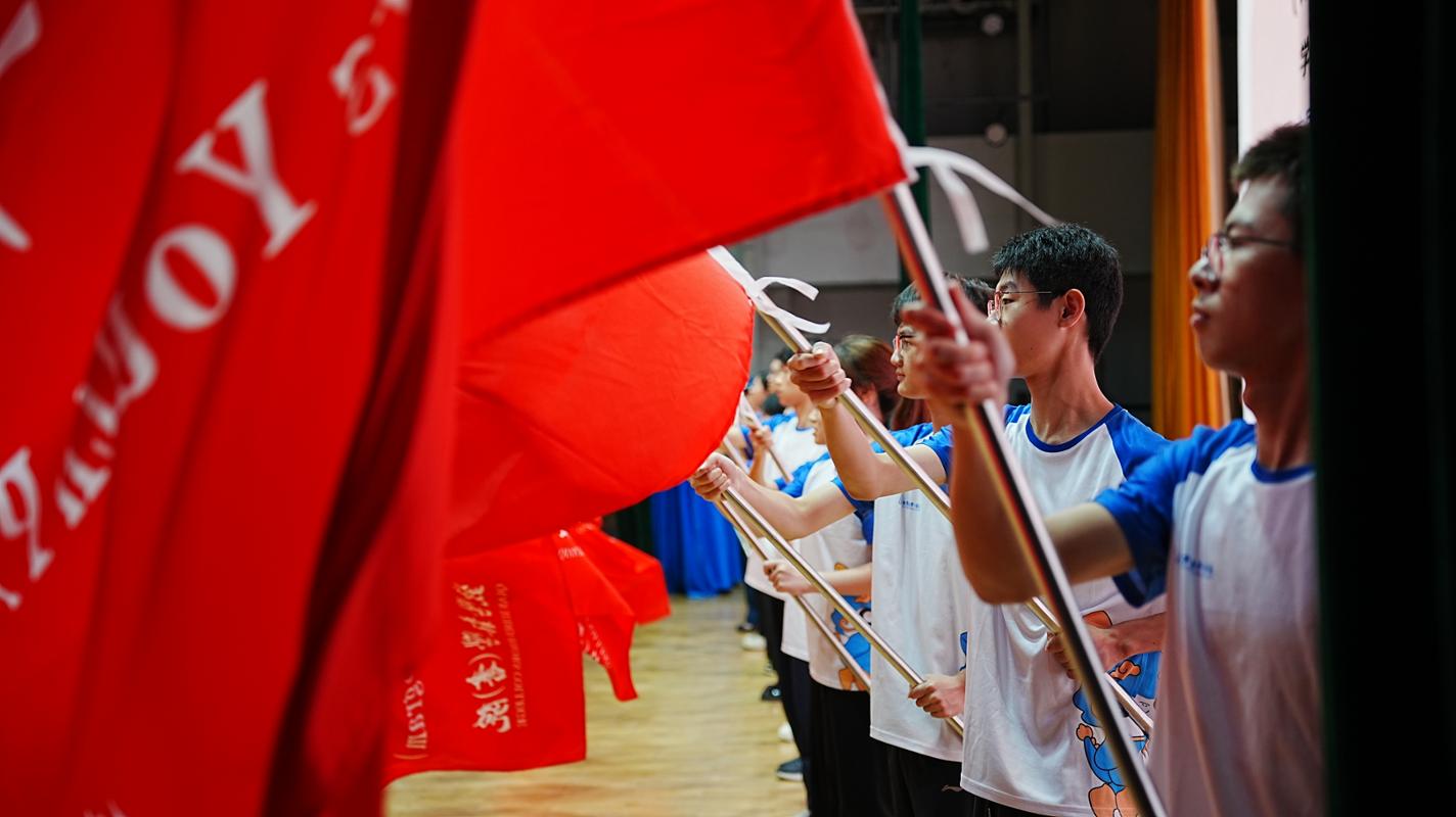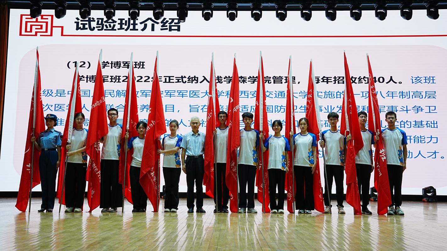 杨森院长为钱学森班、少年班等12类试验班授旗,并与学生代表们合影,接过钱学森学院试验班的大旗,象征着钱学森精神将在新一级钱院学子中传承发扬下去。