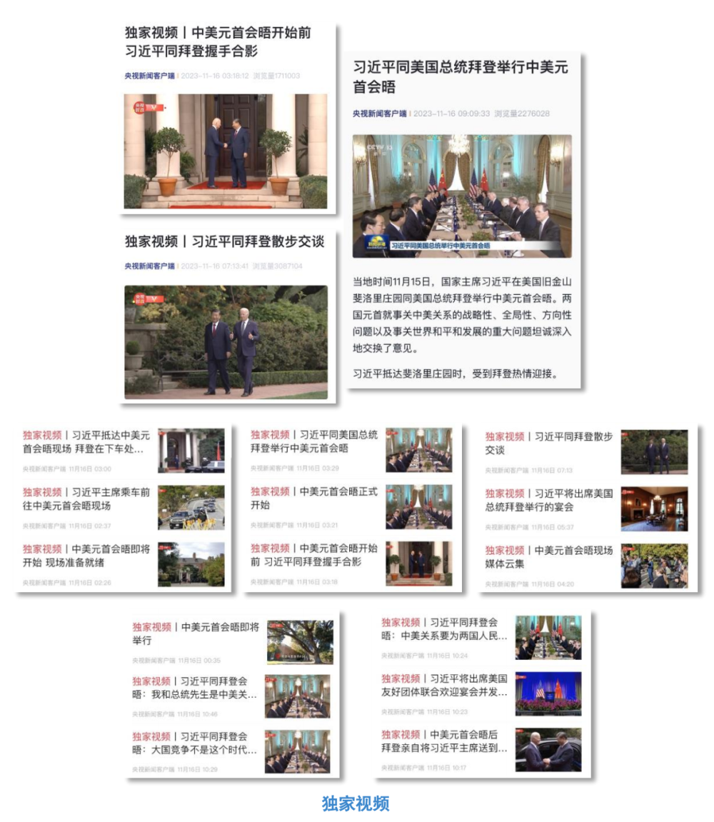 全程记录,总家报道“刷屏”全网!围绕会晤即将举行、开始前握手合影、开场白等重要节点,央视新闻新媒体“零时差”快制快发,首发首推29条时政快讯和独家视频,成为全网稿源。《中美元首会晤开始前 习同拜登握手合影》等14条独家视频精准捕捉下车处迎接、散步交谈、相互道别等两国元首互动细节,均获全网置顶推荐,登上多个平台热榜。其中,仅《习同拜登散步交谈》全网总触达量即超15.1亿。